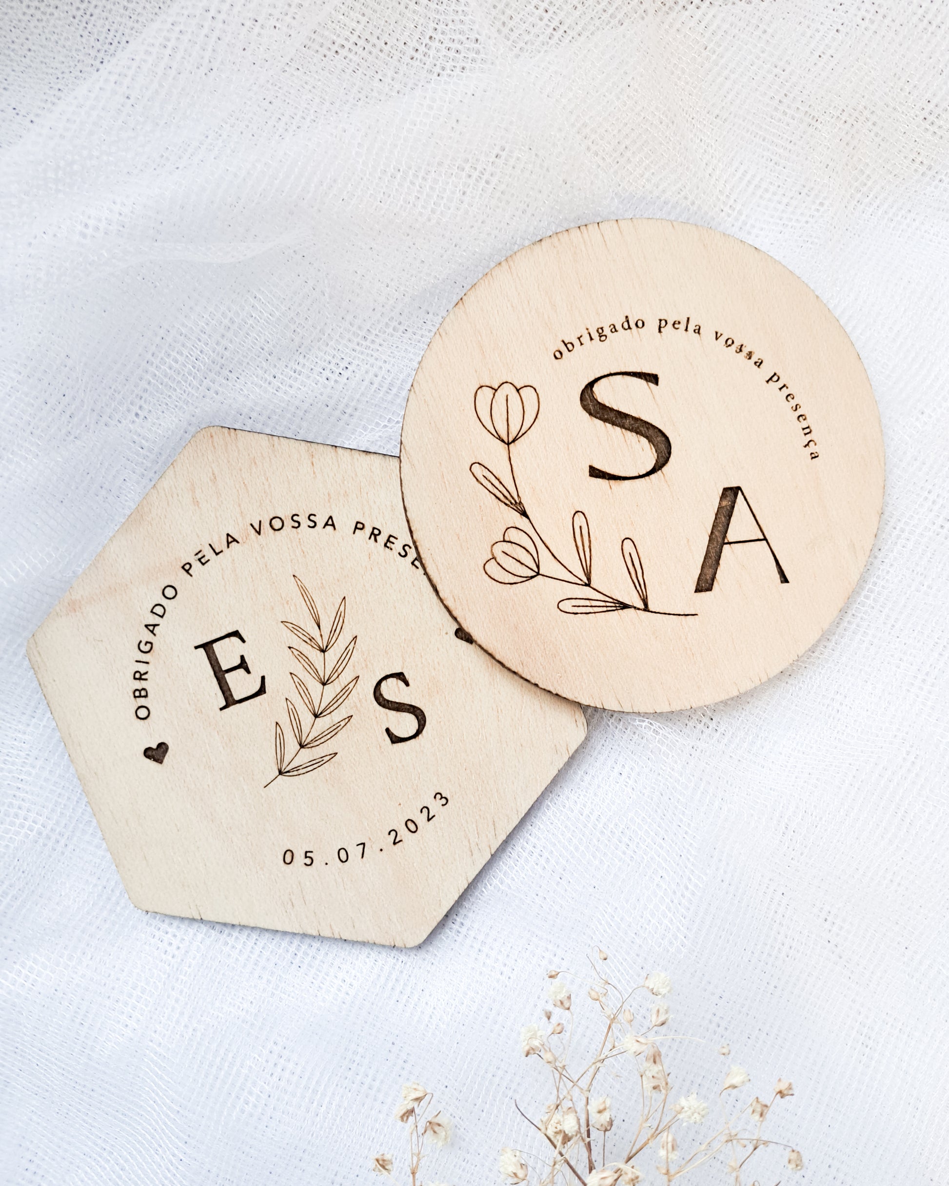 Porque não oferecer umas bases para copos personalizadas no tema do vosso casamento? Uma lembrança útil e única.