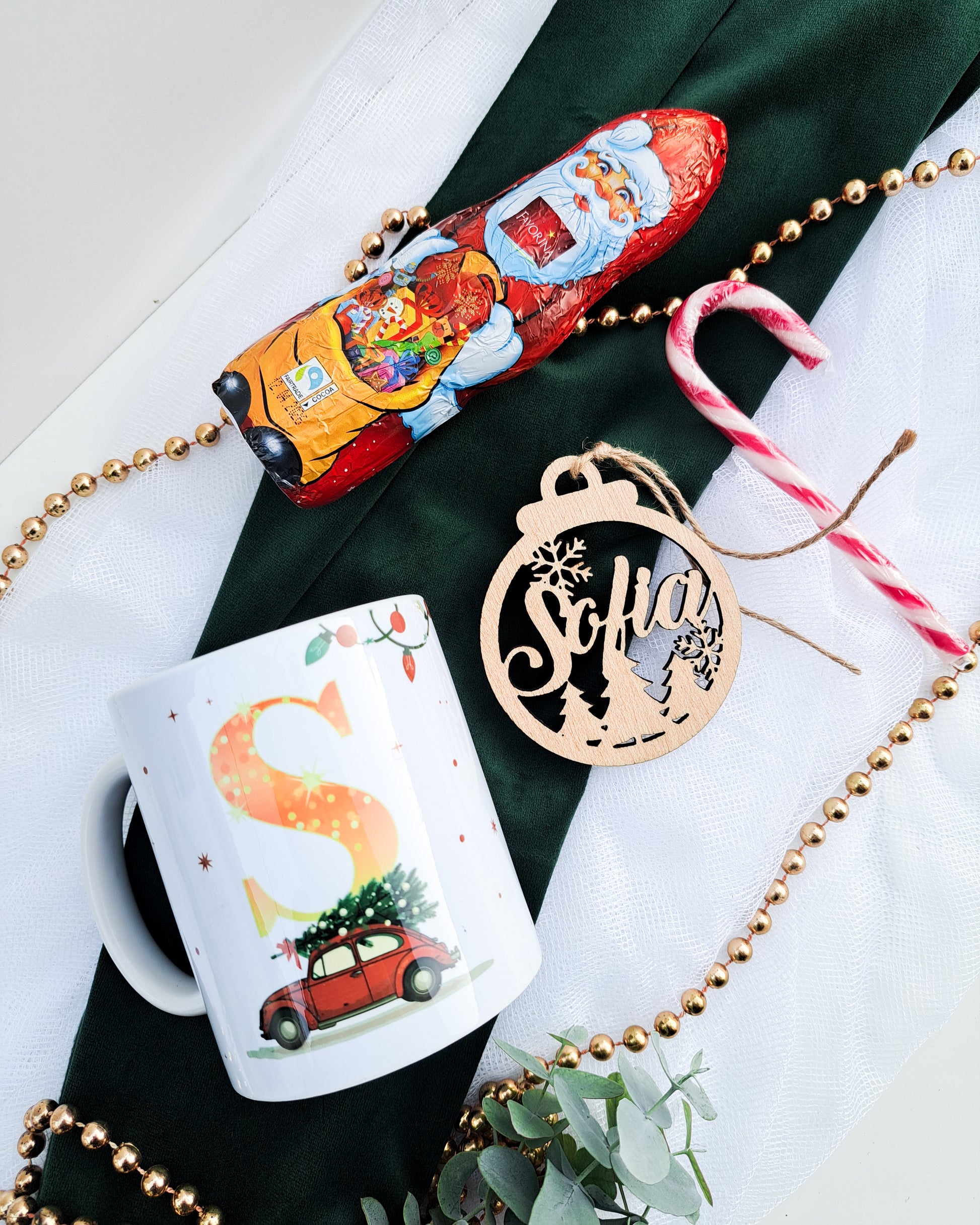 A inicial na caneca e o nome no enfeite podem ser alterados.